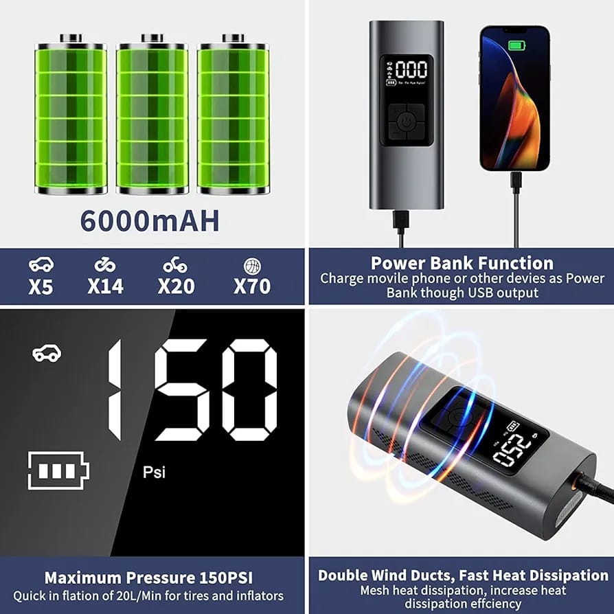 Stay powered up and pumped up wherever you go with our Air Compressor Power Bank – a compact yet powerful gadget that combines two must-have tools in one sleek design. Whether you're on a road trip, facing an emergency, or just need to inflate a tire or charge your phone, this device has you covered!