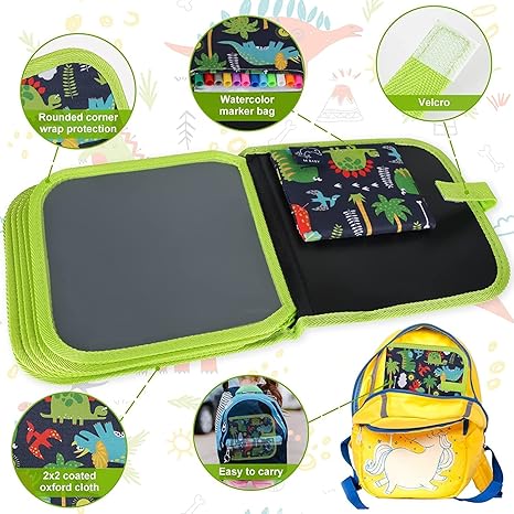 Our erasable doodle board is made of Non-Toxic synthetic leather and PE board. 6 Watercolor pens are also Dust-Free. Environmentally friendly material is safe for children. Tips: If kids draw the pens on a cloth or hand, just rinse with water.