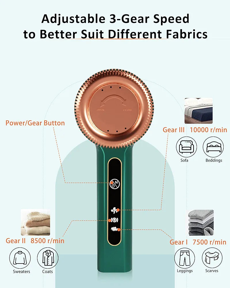✨【𝗔𝗱𝗷𝘂𝘀𝘁𝗮𝗯𝗹𝗲 𝟯-𝗚𝗲𝗮𝗿 𝗦𝗽𝗲𝗲𝗱𝘀 to Better Suit Different Fabrics】Simply short press “ Power/Gear Button" of the lint remover for clothes, you can choose appropriate speed (Gear I/II/III) according to the softness of the fabric and the length of lint to remove fuzz lint pills quickly and efficiently.
