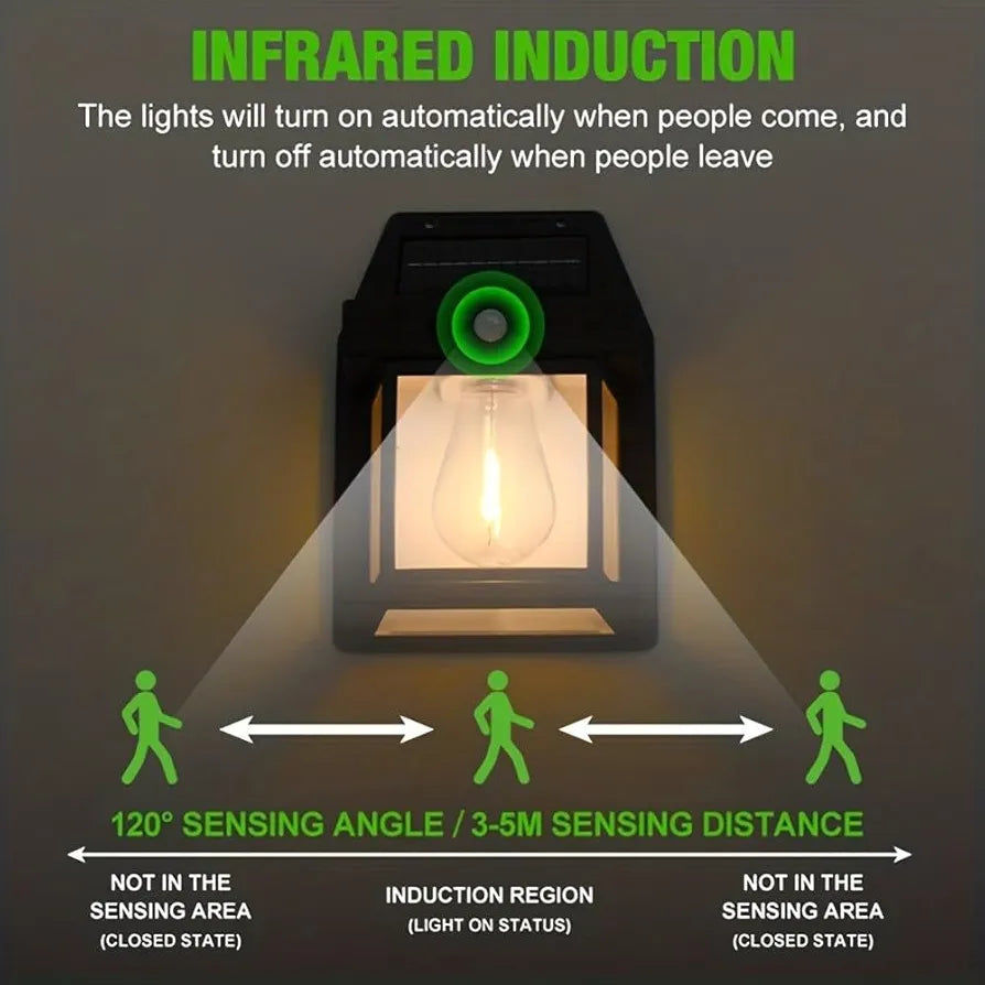 【3 Motion Sensor】The solar wall light has a built-in intelligent motion sensor that sensitively detects motion within a 120° angle within 8 meters. Press the on/off to switch 3 different modes: 1.When motion is detected, the wall light will turn on to 100%, and will be off after the movement leavs for 15s. 2. When motion is detected, it will turn on to 100%, the solar wall light will change to 50% brightness after the movement leaves for 15s. 3. Always keep 50% low brightness mode all night.